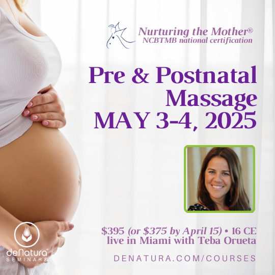 (16 CE) The premier nationally recognized certification, taught since 1988, in pregnancy massage, labor massage and support, postpartum massage and newborn/infant massage with a live, hands-on clinic.